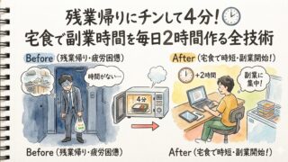 「時間がない」は言い訳。帰宅後の料理を「宅食」に変えれば、残業続きでも毎日2時間の副業時間は作れます。チンして4分で食事を完結させ、月5万稼ぐための具体的な夜のスケジュール術を公開。