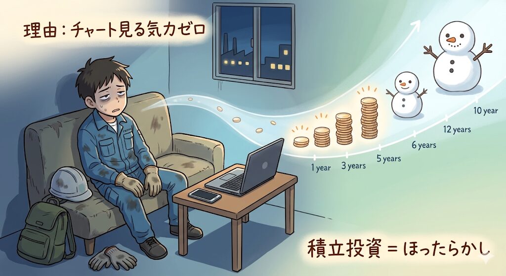 結論から言うと、僕たちのような忙しい工場勤務に積立投資がピッタリな理由は、「完全にほったらかしでOKだから」です。