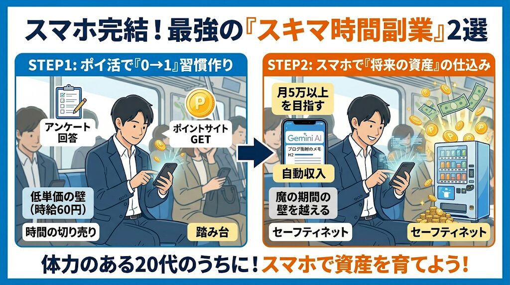 お待たせしました。ここからは、今日からすぐに始められるPC不要の副業を2つ紹介します。結論から言うと、「①で副業の基礎体力をつけ、②で将来の資産を作る」という順番でステップアップするのが、挫折しない最強のルートです。