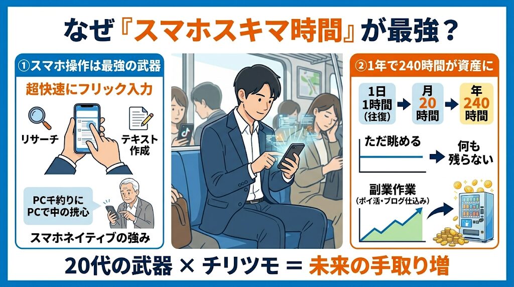 実は、手取りの少なさに悩む20代の会社員にとって、通勤電車などの「スマホを使ったスキマ時間」こそが、最も確実で最強の副業タイムになります。その理由は大きく分けて2つあります。