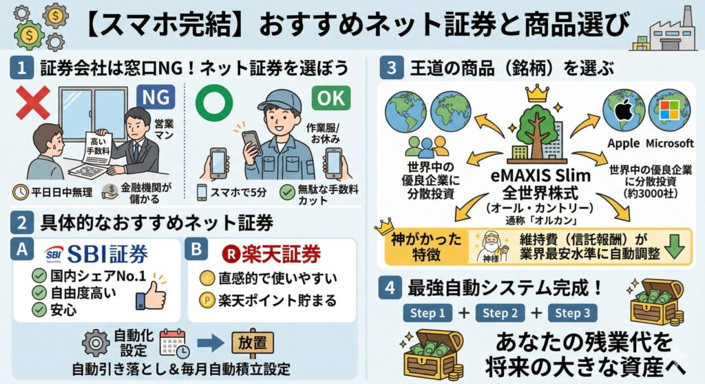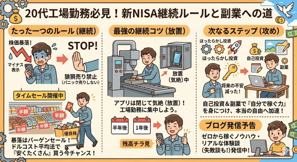 これこそが、毎日過酷な現場で働く工場勤務のあなたが、投資の世界で最終的に勝つための最強のルールです。あなたの貴重な残業代が、将来の大きな安心に変わる日を楽しみに、今日から「ほったらかし投資」をスタートさせましょう!