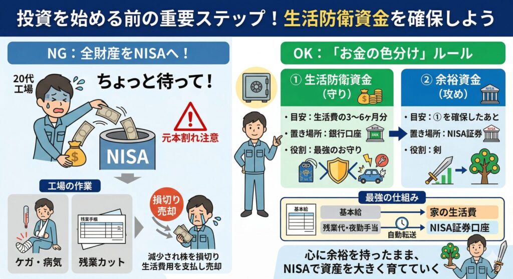 工場での勤務は、体力勝負であるがゆえのケガや病気のリスク、あるいは会社の業績悪化による「突然の残業カット」などで、手取り収入がガクッと下がる月もありますよね。そんな時に、手元の現金をすべて投資に回してしまっていると、生活が立ち行かなくなってしまいます。