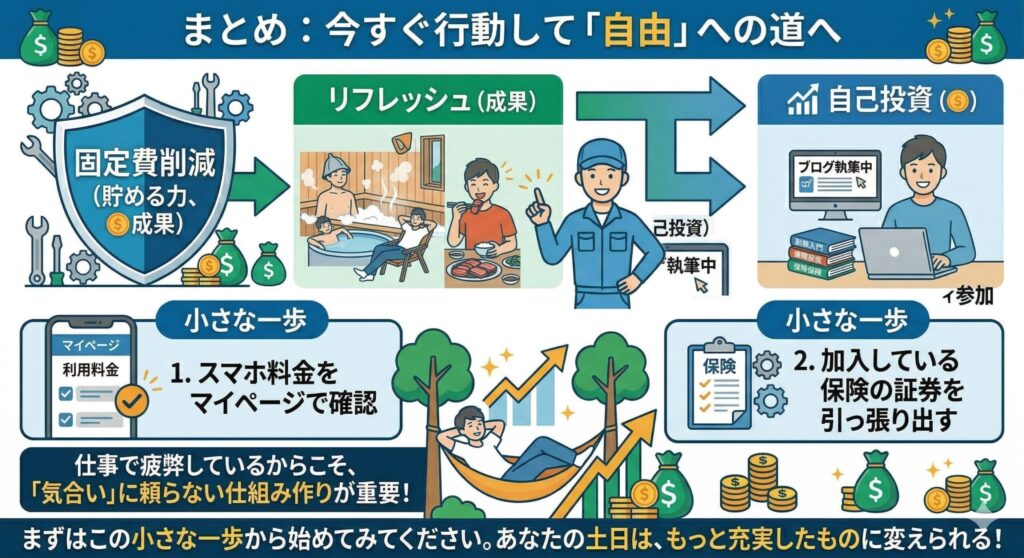 体力が回復し、精神的なゆとりが生まれたら、その浮いたお金を自己投資に回しましょう。
