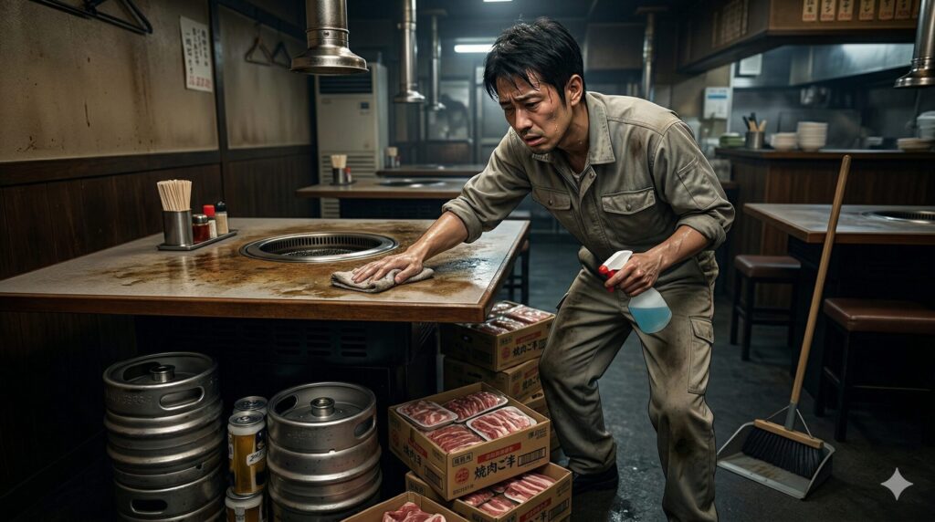 • 終わりの見えない掃除: 広い店内の掃き掃除に加え、前日の油でギトギトになった無数のテーブルをひたすら拭き上げる作業。