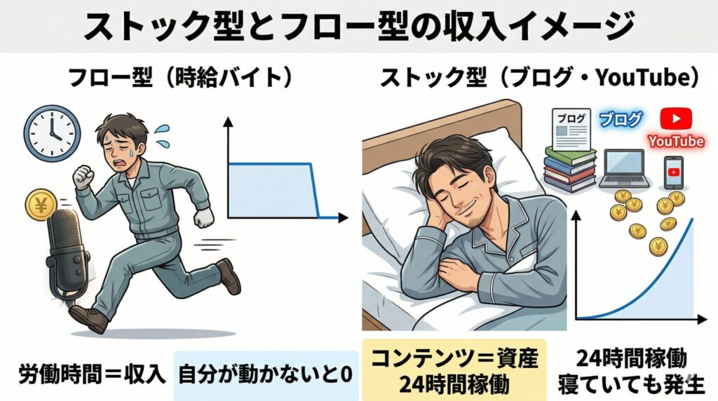 一方、ブログやYouTubeは「ストック型」です。一度魂を込めて作った記事や動画は、あなたが工場で汗水流して働いている間も、夜勤明けで泥のように眠っている間も、インターネット上で誰かに読まれ(見られ)続けます。