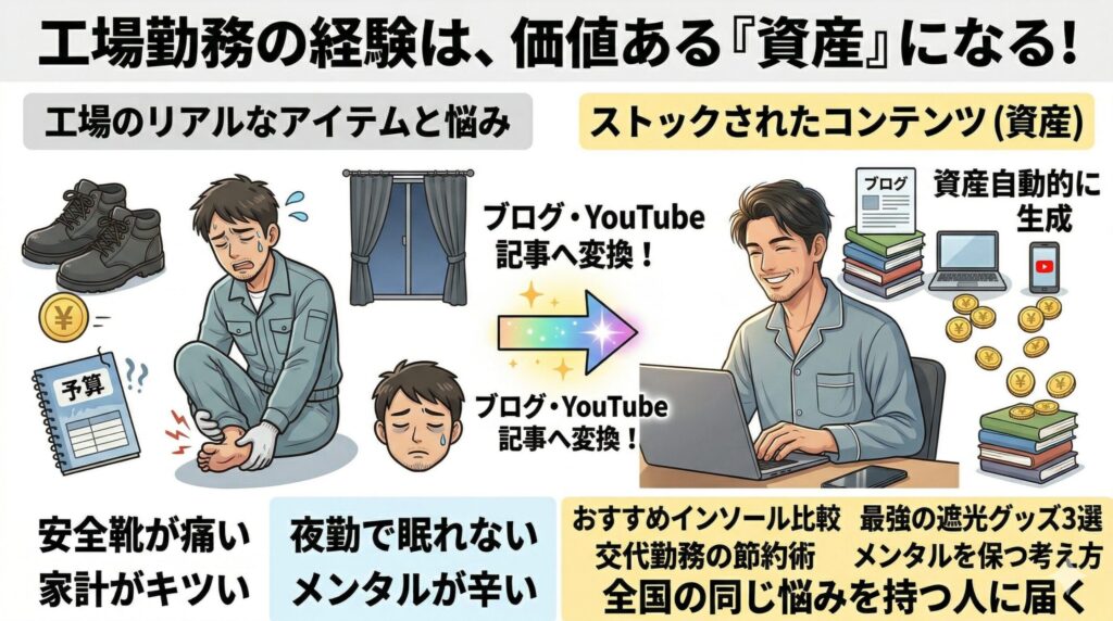 • 工場勤務の経験は武器になる: あなたが現場で抱えているリアルな悩みや工夫は、同じ境遇の人にとって喉から手が出るほど価値のある情報(資産)になる。