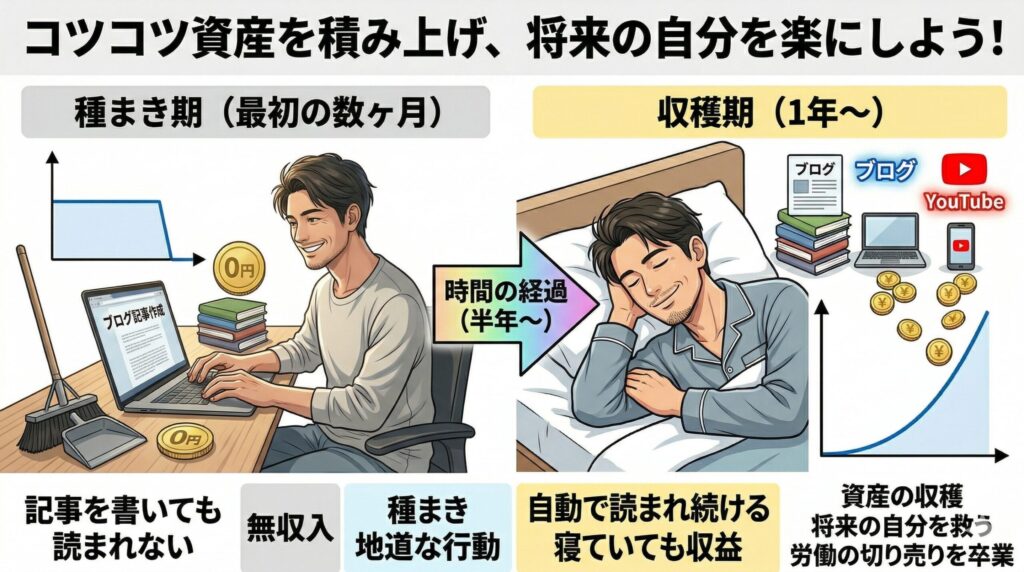 最初は必ずこの壁にぶつかります。しかし、時給思考のままでは一生「労働の切り売り」から抜け出すことはできません。ブログやYouTubeは、いわば「畑に種をまき、水をやる作業」と同じです。