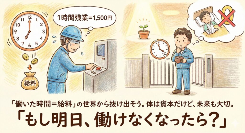 工場勤務の私たちは、毎日体を動かして、その対価としてお給料をもらっていますよね。 「1時間残業したから、1,500円プラスだ」 この感覚が体に染み付いていると思います。