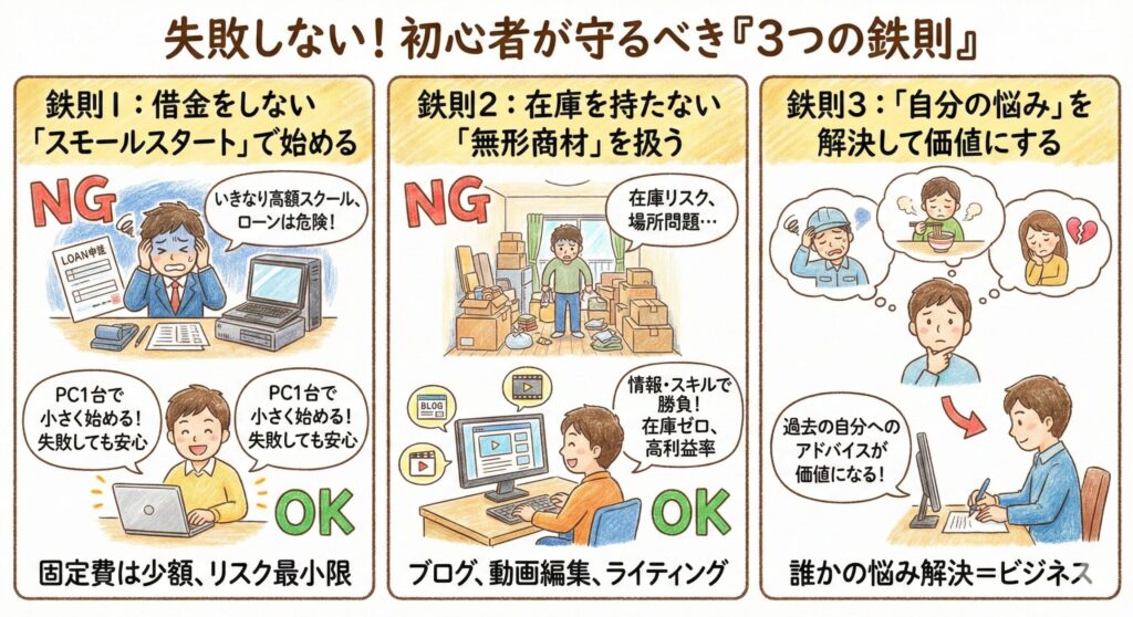 - 借金ゼロ・在庫ゼロの「スモールスタート」を徹底する。